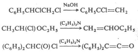 Из вицинальных и геминальных дигалогенопроизводных образуются винилгалогениды, из a-галогенэфиров и галогеногидринов - эфиры енолов, при действии третичных аминов на хлорангидриды к-т - кетены, напр.:
