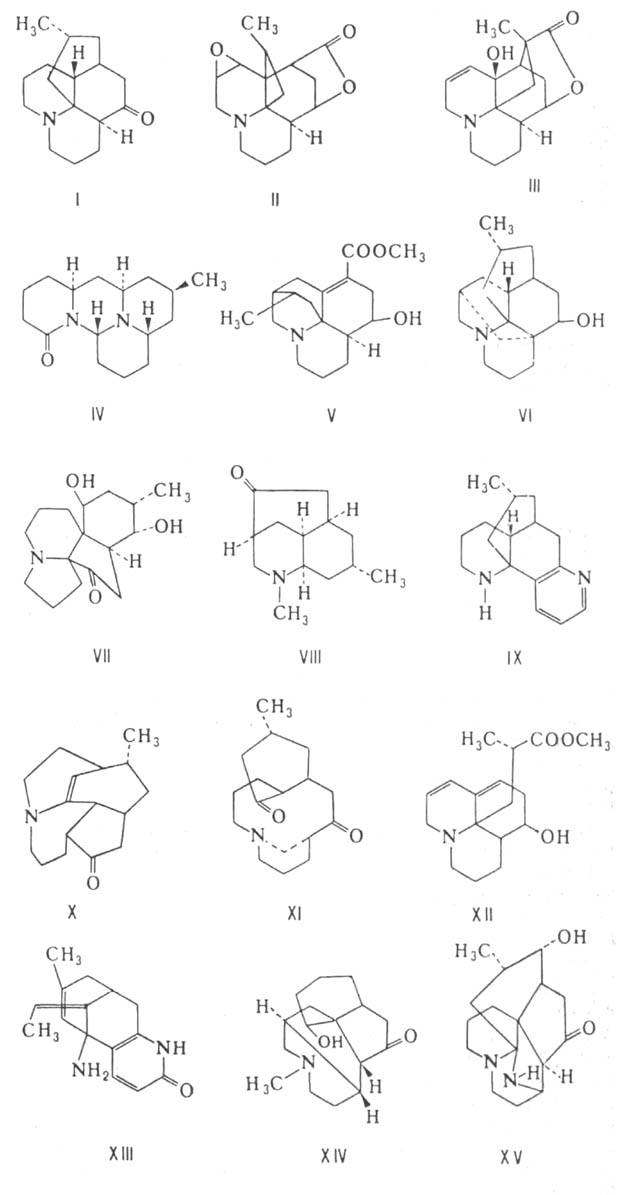 АЛКАЛОИДЫ ЛИКОПОДИУМА (алкалоиды плауна), выделены из растений рода плаун (Lycopodium) семейства плауновых. Включают ок. 100 представителей. Различают алкалоиды типа ликоподина (ф-ла I), аннотинина (II), аннотина (III), цернуина (IV), анноподина (V), ликопекурина (VI), серратинина (VII), луцидулина (VIII), ликодина (IX), фавцеттидина (X), ликофлексина (XI), ликоннотина (XII), селагина (XIII), паникулатина (XIV) и основания R (XV). Представители типов IV, IX, XIII и XV содержат по два' атома азота в молекуле, представители остальных типов по одному. При дегидрировании многие алкалоиды ликоподиума образуют метильные производные хинолина. Алкалоиды ликоподиума выделяют в виде перхлоратов. Нек-рые алкалоиды ликоподиума получены синтетически. Наиб. распространены ликоподии с т. пл. 116°С, [
