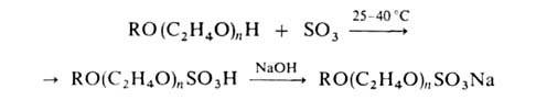 NH4OSO3R. Сульфирование низших спиртов проводят в среде самого спирта, высших-в р-рителе (СНС13, СС14, тетрахлорэтилен). Алкилполиоксиэтиленсульфаты (сульфоэтоксилаты) получают обычно по схеме:
