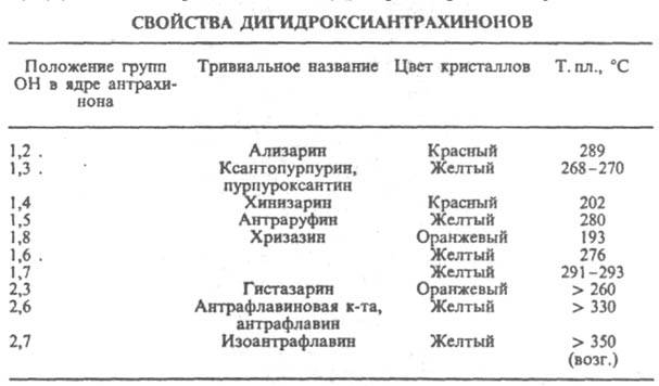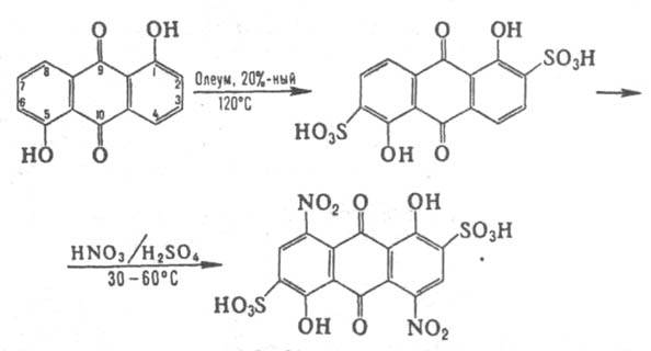 ДИОКСИАНТРАХИНОНЫ (дигидроксиантрахиноны), мол. м. 240,2. Наиб. практическое значение имеют 1,2-диоксиантрахинон (ализарин)и 1,4-диоксиантрахинон (хинизарин), а также 1,5- и 1,8-диоксиантрахиноны (см. табл.). Диоксиантрахиноны плохо раств. в воде, этаноле, диэтиловом эфире, раств. в конц. H2SO4, р-рах щелочей с углублением окраски. Подобно фенолам и нафтолам, ацилируются и алкилируются по гидроксигруппам, причем b-гидроксигруппы реагируют легче, чем a-гидроксигруппы. Электроф. замещение в антрахиноновое ядро происходит в орто- и пара-положения к гидроксигруппам. При сульфировании 1,5- и 1,8-диоксиантрахинонов и дальнейшем нитровании нитрующей смесью образуются соотв. 1,5-дигидрокси-4,8-динитроантрахинон-2,6- и 1,8-дигидрокси-4,5-динитроантрахинон-2,7-дисульфокислоты промежут. продукты для получения синих дисперсных красителей, напр.:
