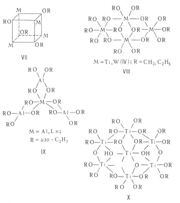 Строение ассоциатов определяется принципом "миним. степени полимеризации", согласно к-рому все атомы М достигают устойчивых координац. чисел (благодаря донорно-акцепторному взаимод. между своб. орбиталями М и парами электронов атомов О алкоксильных групп соседних молекул). Алкоголяты мономерны только в случае полидентатных или очень разветвленных алкоксилов (см. ф-лы I, II). Ассоциаты могут иметь разнообразное строение. Димеры способны образовать структуру из двух многогранников, напр. тетраэдров (III) или октаэдров (IV) с общим ребром (OR)2, кластеры Мо или W, содержащие кратные связи М—M(V). Молекулы тримеров представляют собой обычно циклоли-нейные цепочки (VI), тетрамеров-кубаны (ТЮСН3, КОС4Н9-трет, CH3ZnOCH3, VII), плоские молекулы из четырех октаэдров с общими ребрами (VIII) или молекулы с центральным октаэдром и тремя тетраэдрами по его ребрам (IX). Метилаты, этилаты и изопропилаты щелочных и щел.-зем. металлов образуют полимерные кристаллич. структуры из слоев тетраэдров (типа анти-РbО) и октаэдров [типа Са(ОН)2] соответственно.
