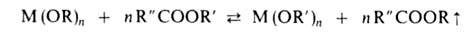 М (OR')n + п ROH сдвигают вправо отгонкой азеотропа ROH с бензолом или многократным введением новых порций ROH. В случае близких т-р кипения обоих спиртов целесообразна замена ROH сложным эфиром: