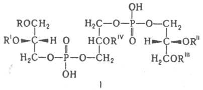 ДИФОСФАТИДИЛГЛИЦЕРИНЫ [1,3-бис-(3-sn-фосфатидил) глицерины; 1,3-бис-(1,2-диацил-sn-глицеро-3-фосфо)-глицерины; кардиолипины], соед. общей ф-лы I, где R, RI, RII и RIII - ацилы высших жирных к-т, RIV = Н. Содержатся в тканях животных, в высших растениях, дрожжах и большинстве бактерий. Один из основных фосфолипидов митохондрий, в к-рых находится гл. обр. во внутр. мембране. Обычно содержание дифосфатидилглицеринов в прир. объектах не превышает 10% от кол-ва всех фосфолипидов; исключение - актиномицеты, у к-рых на долю дифосфатидилглицеринов приходится до 60%.
