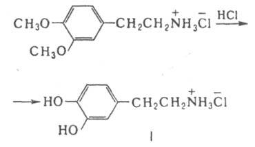 ДОФАМИН [гидрохлорид 2-(3,4-дигидроксифенил)этиламина, допамин, допмин, cardiosteril, ф-ла I], относится к катехоламинам; мол. м. 189,66; бесцв. или с кремовым оттенком кристаллы; т. пл. 245-249 °С; хорошо раств. в воде и этаноле; инактивируется на свету, при действии щелочей и окислителей. Дофамин - промежут. продукт в биосинтезе норадреналина из тирозина. Получают обработкой гидрохлорида гомовератриламина соляной к-той при 100-115 °С: