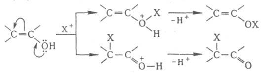 В отдельных случаях енольную форму удается стабилизировать, напр., комплексообразованием. Енолы- типичные амбидентные нуклеофилы, реагируют с электроф. агентами (Х+ ) по атомам О или С: