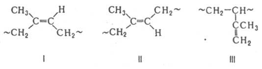 ИЗОПРЕНОВЫЕ КАУЧУКИ СИНТЕТИЧЕСКИЕ (полиизопрены, ПИ, СКИ-3, америпол, европрен, карифлекс, каром, курапрен, натсин, нипол), полимеры изопрена. Наиб. практич. ценность представляют стереорегулярные изопреновые каучуки - аналоги каучука натурального, синтезируемые полимеризацией изопрена в р-ре в присут. катализаторов Циглера - Натты (комплексов соед. Ti с алюминийорг. соед.), а также лития или литийалкилов.Структура и свойства каучуков. Звенья изопрена в макромолекуле изопренового каучука могут иметь конфигурации 1,4-циc (I), 1,4-транс (II), и 3,4 (III):