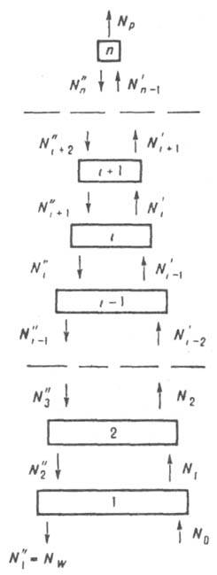 Рис. 1. Схема каскада с рециркуляцией потока смеси (N - молярная доля выделяемого изотопа; N0 - в исходной смеси; N'i и N:i - соотв. в обогащенной и обедненной фракциях i-ступени; Np - в продукте (Np=N'n); Nw в отходах (Nw - N:1).