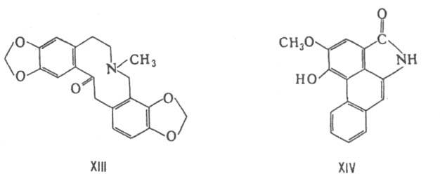 ИЗОХИНОЛИНОВЫЕ АЛКАЛОИДЫ, содержат в молекуле остатки 1,2,3,4-тетрагидроизохинолина, значительно реже - 3,4-дигидроизохинолина или изохинолина. Обнаружены в растениях 30 семейств. Наиб. богаты ими растения семейства анноновых (Annonaceae), барбарисовых (Berberidaceae), дымянковых (Fumariaceae), гернандиевых (Hernandiaceae), лавровых (Lauraceae), магнолиевых (Magnoliaceae), луносемянниковых (Menispermaceae), монимисвых (Monimiaceae), маковых (Papaveraceae), лютиковых (Ranunculaceae). Изохинолиновые алкалоиды включают более 1000 представителей. Изохинолиновые алкалоиды содержат от 10 до 42 атомов С. Выделяют след. основные группы алкалоидов: простые изохинолины (напр., корипаллин, ф-ла I), 1-бензилизохинолины (папаверин, II), апорфины (глауцин, III), проапорфины (пронуциферин, IV), протоберберины (берберин), бензофенантридины (сангвинарин, V), павины (аргемонин, VI), фталидизохинолины (наркотин, VII), спиробензилизохинолины (охотенсимин, VIII), 2-бензилтетрагидроизохинолины, 1-фенил- и 4-фенилтетрагидроизохинолины, азофлуорантены (руфесцин, IX), дибензопирроколины (криптаустолин, X), трополоизохинолины (имерубрин, XI). Фенантреновые основания (таликтуберин, XII), протопиновые основания (протопин, XIII) и аристолактамы (дорифлавин, XIV) не имеют изохинолиновой системы, но также относятся к изохинолиновым алкалоидам, с к-рыми биогенетически тесно связаны.