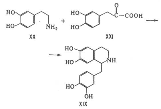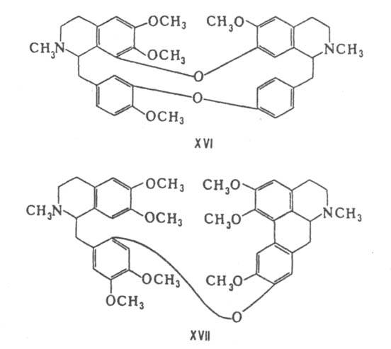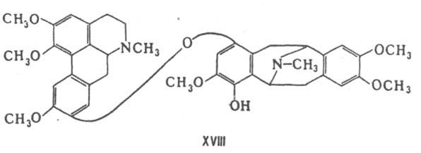 Среди изохинолиновых алкалоидов обнаружены димерные и тримерные основания, напр., пилоцереин (XV). Наиб. многочисл. группы апорфинов и димерных оснований. Последние включают более 250 алкалоидов, образующихся в результате окислит. димеризации бензилизохинолинов (как, напр., тетрандрин, XVI), бензилизохинолинов с апорфинами (таликарпин, XVII), проапорфинами, оксоапрофинами, а также апорфинов (бисапорфины), апорфинов с павинами (пенсилпавин, XVIII). Многообразие димерных алкалоидов обусловлено числом эфирных мостиков и их положением в молекуле. К изохинолиновым алкалоидам относятся также гликоалкалоиды, у к-рых агликон - апорфин или бензилизохинолин. Многие изохинолиновые алкалоиды синтезированы. В ряде случаев осуществлен взаимный переход между разл. типами алкалоидов. Наиб. значение имеют алкалоиды группы 1-бензилизохинолина (XIX) - предшественники в биосинтезе большинства изохинолиновых алкалоидов. Соед. XIX образуется в растениях, конденсацией допамина (XX) и 3,4-дигидроксифенилпировиноградной к-ты (XXI), образующихся из тирозина. Многие изохинолиновые алкалоиды обладают противомикробной, спазмолитич., гипотензивной, желчегонной или противовоспалит. активностью. Ряд димерных оснований (напр., XVI и XVII) подавляют рост злокачеств. опухолей.