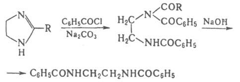 Наиб. изучены 2-имидазолины. Они представляют собой циклич. амидины и являются сильными основаниями. Для незамещенного 2-имидазолина положения 4 и 5 равноценны, как и в имидазоле. Кольцо 2-имидазолинов малоустойчиво и легко расщепляется при бензоилировании или обработке бензолсульфохлоридом в присут. щелочей с образованием ацильных или бензолсульфамидных производных 1,2-диамидоэтана, напр.:
