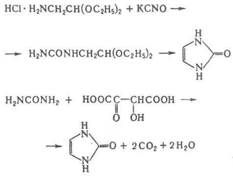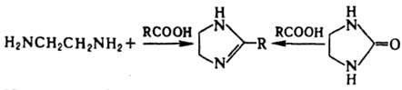 Для соед. IV и V образование таутомерией формы наблюдается лишь при наличии в кольце сильного электроно-акцепторного заместителя. В разб. к-тах 2-имидазолиноны легко димеризуются. В ряду 3-имидазолинов известны гл. обр. N-гидроксиды и стабильные китроксильные радикалы. Незамещенный 2-имидазолин получают циклизацией N,N'-диформилэтилендиамина при 400-600 °С в присут. силикагеля. Замещенные 2-имидазолины синтезируют взаимод. карбоновых к-т с 1,2-этилендиамином (в присут. НСl или n-толуолсульфокислоты) или 2-имидазолидиноном (N,N'-этиленмочевиной):