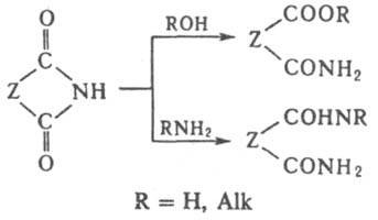 Они легко гидролизуются в кислой и щелочной средах до моноамидов дикарбоновых к-т (амидокислот). Алкоголиз приводит к амидоэфирам, аммонолиз и аминолиз - к диамидам: