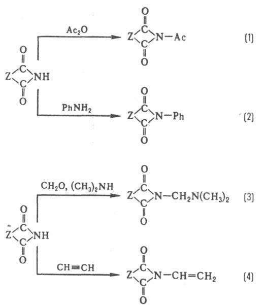 Имиды карбоновых кислот исключительно устойчивы к окислению, но легко восстанавливаются комплексными гидридами металлов, водородом в присут. катализаторов или электрохимически, причем циклические образуют, в зависимости от условий, a-гидроксилактамы, лактамы или амины. Линейные имиды карбоновых кислот получают ацилированием первичных или вторичных амидов ангидридами, галогенангидридами, изопропениловыми эфирами карбоновых к-т или кетенами. Циклич. имиды карбоновых кислот образуются при циклизации азотсодержащих производных дикарбоновых к-т - моноамидов, диамидов, эфироамидов, мононитрилов, напр.:
