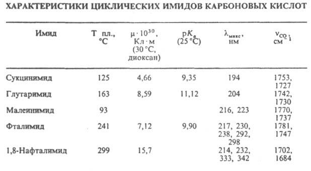 Анализ имидов карбоновых кислот основан на их превращ. в гидроксамовые к-ты и колориметрич. определении последних, а также на полярографич. восстановлении. Производные имидов карбоновых кислот- вулканизующие агенты, дисперсные красители и пигменты с высокой светопрочностью, регуляторы роста растений, фунгициды, бактерициды, лек. ср-ва. См. также Полиимиды.