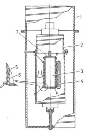 Рис. 2. Адиабатический калориметр-контейнер для определения теплоемкости твердых и жидких в-в при низких т-рах: 1, 2 - адиабатич. оболочки; 3 - калориметр; 4 - платиновый термометр сопротивления; 5 - нагреватель; 6 - герметичный платиновый контейнер для в-ва; 7 - крышка контейнера.