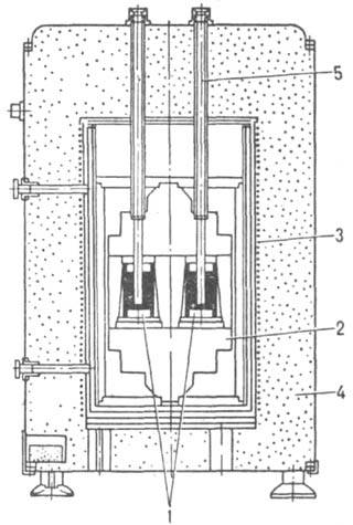 Рис. 3. Микрокалориметр Кальве: 1 - калориметрич. камера, окруженная термоспаями детекторной и компенсационной термобатарей; 2 - блок (оболочка) калориметра; 3 - термостатирующая оболочка; 4 - тепловая изоляция; 5 - трубка для введения в-ва в калориметр.