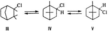 При гидрировании камфена на платиновом кат. образуется изокамфан (2,2,3-триметилнорборнан, т. пл. 65 °С, т. кип. 166°С/760мм рт. ст. или 100/100). При гидратации камфена в зависимости от условий образуются камфенгидрат (2,2,3-триметил-3-норборнанол, т. пл. 151-152°С, ф-ла II) или смесь вторичных спиртов - борнеола и изоборнеола. При действии на камфен соляной к-ты образуется равновесная смесь изомерных хлоридов: камфенгидрохлорида (2,2,3-триметил-3-хлорнорборнана, т. пл. 125-127°С, III), борнилхлорида (т. пл. 132°С, IV), изоборнилхлорида (т. пл. 161,5 °С, V) с преобладанием последнего. Взаимод. камфеном с бромистоводородной и иодистоводородной к-тами приводит в осн. к соответствующим изоборнилгалогенидам. См. также Камфеновые перегруппировки.