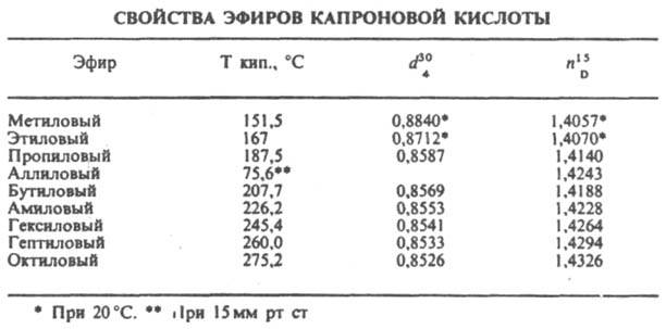 Мн. эфиры капроновой кислоты (см. табл.) обладают фруктовым запахом и применяются в качестве эссенций. Т. всп. капроновой кислоты 116°С, т. самовоспл. 120 °С; ПДК 5 мг/м3. Д. В. Иоффе.