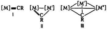 КАРБИНОВЫЕ КОМПЛЕКСЫ ПЕРЕХОДНЫХ МЕТАЛЛОВ, содержат в качестве лиганда карбин (алкилидин) CR, где R - орг. остаток. наиб. изучены моноядерные комплексы ф-лы I, где [М] металл с лигандами. Известны также би- и триядерные комплексы (ф-лы соотв. II и III), в к-рых группа CR занимает мостиковое положение. Большинство комплексов типа I раств. в орг. р-рителях, мн. устойчивы ниже 0°С и разлагаются при 25 °С с образованием ацетиленов. Более устойчивы комплексы типов II и III.
