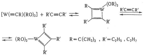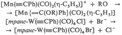 Эта р-ция используется для метатезиса ацетиленов в мягких условиях. При действии фосфинов карбиновый лиганд комплексов взаимод. с др. лигандами, напр., с Со: