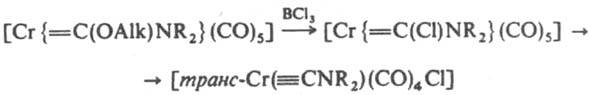 Осн. метод синтеза комплексов типа I - действие к-т Льюиса на алкоксикарбеновые комплексы с образованием неустойчивых галогенкарбеновых комплексов, претерпевающих затем окислит. присоединение по связи С-Hal, напр.: