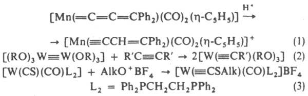 Они м.б. также получены протонированием алленилиденовых комплексов (ур-ние 1), расщеплением связи С=С комплексами металлов подгрупп Va и VIa (2), присоединением электрофилов к тиокарбонильному лиганду (3):