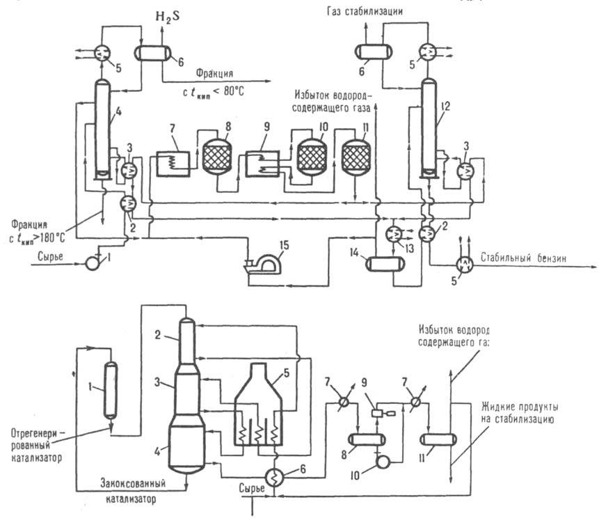 Схемы промышленных установок. Принципиальная технол. схема каталитического реформинга: предварит, гидроочистка сырья; смешение очищенного сырья с водородсодержащим газом и подогрев смеси в теплообменнике; собственно каталитический реформинг смеси последовательно в трех (иногда в четырех) реакторах-стальных цилиндрич. аппаратах; охлаждение полученного гидрогенизата; отделение последнего от водородсодержащего газа в сепараторе высокого давления и от углеводородных газов в сепараторе низкого давления с послед, ректификацией на целевые продукты и их стабилизацией; выделение ароматич. углеводородов (только при целевом получении индивидуальных соед.); осушка газов и их очистка от примесей. На установке каталитического реформинга с неподвижным слоем катализатора (рис. 2) гидроочищенное сырье подвергают предварит, стабилизации и ректификации в спец. колонне. Из ее верх, части отводятся легкие фракции, выкипающие до 80-190 °С, и H2S. Для переработки отбирают фракцию, выкипающую в пределах 80-190 °С; последняя в смеси с циркулирующим