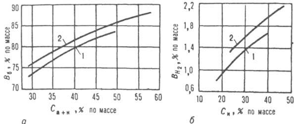 Рис. 1. Влияние углеводородного состава сырья на выходы бензина с октановым числом 95 по исследоват. методу (а) и водорода (б): 1 - фракция, выкипающая в пределах 85-180°С; 2 - то же в пределах 105-180°C; B6, BH2 - выходы соотв. бензина и водорода; Са+м суммарное содержание в сырье ароматич. и нафтеновых углеводородов; Са- содержание в сырье нафтеновых углеводородов.
