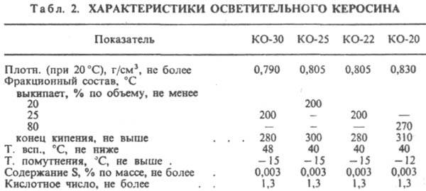 состав керосина. Для предотвращения обугливания фитиля и засорения его пор смолами, нафтеновыми к-тами и др. (вследствие чего уменьшаются подача керосина по фитилю и сила света) в высококачественном керосине должно быть макс. кол-во легких фракций. Поэтому в составе осветит. керосина предпочтительны повыш. содержание предельных алифатич. углеводородов и пониженное - ароматических, что приводит к уменьшению нагара и копоти и увеличению ВНП. Повышению последней и улучшению иных эксплуатационных св-в керосина способствует также его гидроочистка. ВНП и др. показатели качества осветительного керосина связаны соотношением: ВНП=137-0,1223r-0,0888T10+1131T50-0,0696T90-0,387A, где r-плотность при 20 °С, кг/м3; Т10, Т50, Т90 - т-ры, при к-рых выкипает соотв. 10, 50 и 90% по объему пробы; А - содержание в керосине ароматич. углеводородов, % по массе.