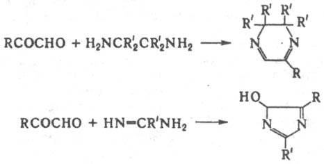 (где R=СН3, С6Н5). При взаимод. a-кетоальдегидов с 1,2-диаминами или амидинами образуются соотв. производные пиразина или имидазола: