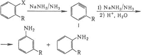 При этом обычно наблюдается образование смеси продуктов Кине-замещения и ипсо-замещения, соотношение к-рых зависит от используемого реагента и заместителя в бензольном кольце. Так, в последней р-ции соотношение продуктов кине-и ипсо-замещения (соотв. мето- и oртo-изомеров) в зависимости от природы R составляют: 85:15 (R = CN), 99:1 (R = F), 95:5 (R = ОСН3), 45:55 (R = СН3), 95:5 [R = N(CH3)2], 15:85 (R = О-), 10:90 (R = NH-), 0:100 (R = Li). Лит.. Эфрос Л.С., Горелик М.В., Химия и технология промежуточных продуктов. Л., 1980, с. 78 82. 343; Общая органическая химия, пер. с англ., т. 1, М., 1981. с. 609; там же, т. 3, М., 1982. с. 436. Д. В. Давыдов.