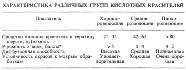 (В - макромолекула волокна). Чем выше кислотность среды, тем выше положит, заряд волокна, и, следовательно, большее кол-во красителя сорбируется волокном. По способности выравнивания окрасок в условиях крашения кислотные красители разделены на три группы (см. табл.).