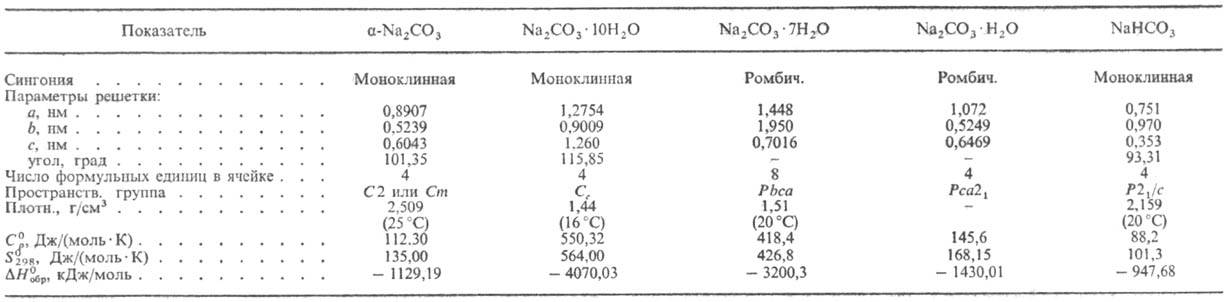 НАТРИЯ КАРБОНАТ (кальцинир. сода) Na2CO3, бесцв. кристаллы; до 350 °С существует а-модификация (см. табл.), в интервале 350-479 °С-b с моноклинной кристаллич. решеткой, а выше 479 °С- гексагoн. модификация g (а = 0,5215 нм, с = 0,6584 нм, z = 2, пространств. группа Р63тс); DH0 переходов a