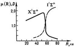 Зависимость дипольного момента m (в дебаях D) молекулы LiF от межъядерного расстояния R для основного