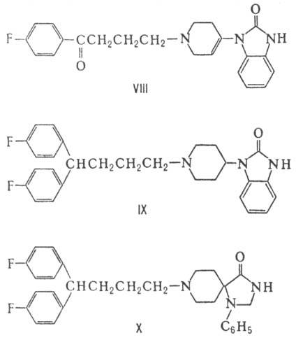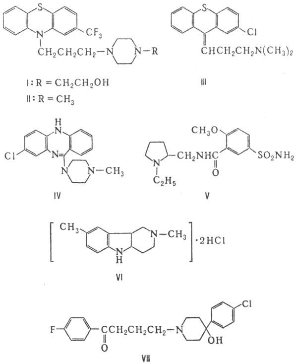 Классификация нейролептических средств основана на их хим. строении с учетом особенностей фармакологич. действия. Выделяют след. группы: 1) фенотиазины-аминазин, фторфеназин (ф-ла 1), трифтазин (II) и др.; 2) тиоксантены, напр. хлорпротиксен (III); 3) трициклич. соед. разного строения, в частности клозапин (IV); 4) сульфамоилбензамиды-сульпирид (V) и др.; 5) производные индола и карболина, напр. карбидин (VI); 6) бутирофеноны-галоперидол (VII), дроперидол (VIII) и др.; 7) дифенилбутилпиперидины, напр. пимозид (IX) и флуспирилен (X); 8) алкалоиды раувольфии (Rauwolfia), в частности резерпин. В хим. строении нейролептических средств имеются общие признаки: 1) наличие группы NH2- или др. акцепторов протонов; 2) присутствие плоского фрагмента, определенным образом ориентированного в пространстве; 3) расстояние между группами, способными образовывать внутримол. водородную связь, составляет 35-65 нм.