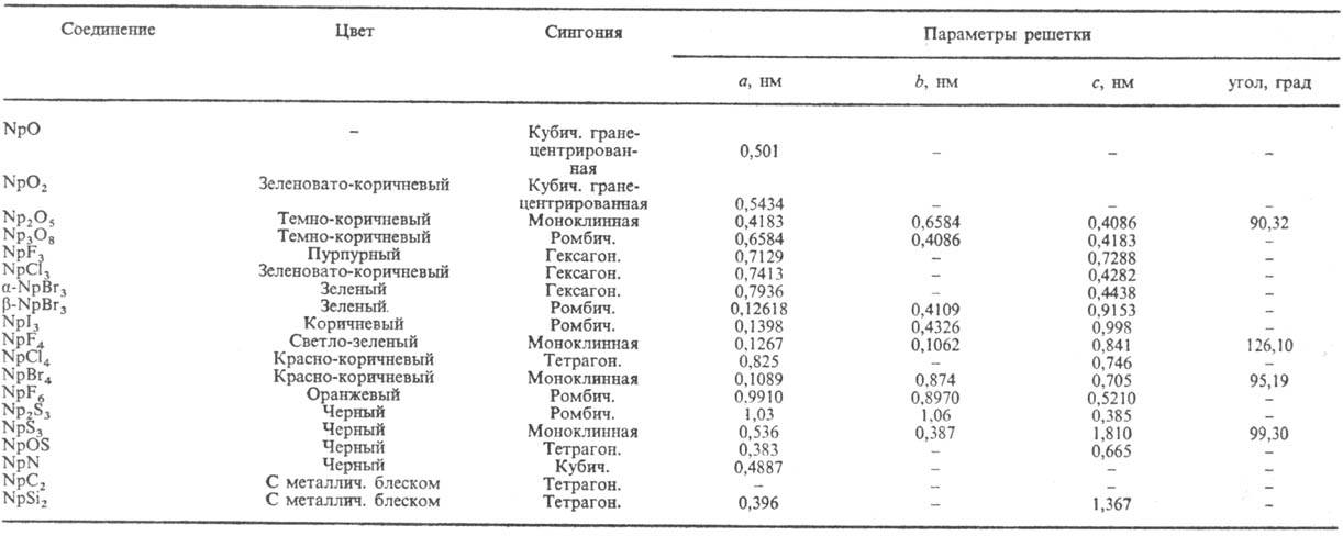 Нептуний весьма реакционноспособен, раств. в разб. НСl с образованием ионов Np3+ в присут. восстановителей или Np4+ в присут. воздуха. При нагр. нептуния в атмосфере Н2 образуются гидриды перем. состава NpH2+x (х = 0-0,7), а также NpH3- черные кристаллы с металлич. блеском (а = 0,3771 нм, с = 0,6713 нм). Св-ва нек-рых соед. нептуния приведены в таблице.