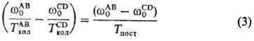 В бинарной газовой смеси двухатомных молекул АВ и CD с близкими частотами колебаний происходит быстрый обмен колебат. квантами при столкновениях как одинаковых, так и разных молекул. При этом устанавливается след. соотношение между колебат. т-рами ТколАВ и ТколCD :