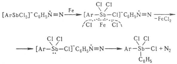 Механизм Несмеянова реакции включает дегалогенирование аниона двойной соли металлом-восстановителем с послед. элиминированием N2 и образованием связи М—С, напр.: