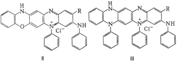 вступает затем в обычные для хинониминовых красителей р-ции с образованием сложной смеси красителей от красновато- до синевато-черных оттенков в зависимости от длительности процесса. Главная составная часть красновато-черных нигрозинов-соед. с оксазиновыми и диазиновыми кольцами (ф-лы II и III; R = Н). В синевато-черных нигрозинах содержатся аналогичные структуры, несущие фениламиногруппы (R = NHC6H5).