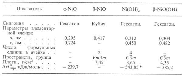 НИКЕЛЯ ОКСИДЫ. Монооксид (минерал бунзенит)-не-стехиометрич. кристаллич. соед. NiOx, где х ~ 1; в зависимости от способа получения и состояния оксида цвет кристаллов может меняться от светло- до темно-зеленого и далее до черного; до 252 °С устойчив a-NiO [антиферромагнетик; С0р 44,3 Дж/(моль•К); S0298 38,0 Дж/(моль•К); см. также табл.]; выше 252°C-b-NiO; т.пл. 1682 °С, однако уже выше 1230 °С начинается диссоциация NiO на металлич. Ni и О2. Обладает слабоосновными св-вами; в воде не раств.; восстанавливается (Н2, С, Mg, Al и др.) до металла. С оксидами др. металлов дает двойные оксиды, напр. типа шпинели BaNiO2.