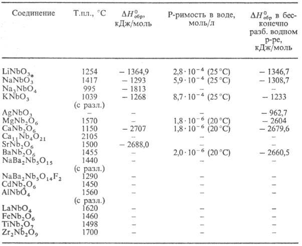 Многие ниобаты имеют структуру типа перовскита, пирохлора, ильменита или ReO3 и обладают пьезо- и сегнетоэлектрич. или электрооптич. св-вами. Метаниобаты Na и К при 400-800 °С выделяют О2 и превращ. в ниобиевые оксидные бронзы. Большинство ниобатов, кроме соед. щелочных металлов с отношением М2О:Nb2О5 больше 1, не раств. в воде. Соли К, как правило, обладают более высокой р-римостью, чем соли Na. Наиб. изучены водорастворимые K8Nb6O19 x х xН2O, K14(HNb6O19)2 . xН2O, Na8Nb6O19•xН2О, NaNbO3.3H2O.