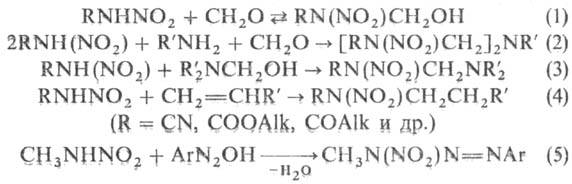 Первичные нитрамины обратимо присоединяются к формальдегиду (р-ция 1), легко вступают в р-цию Манниха (2,3), присоединяются к соед. с активир. двойной связью (р-ция Михаэля, 4), конденсируются с ароматич. диазосоед. (5), а также раскрывают oксирaновый цикл, образуя b-нитррами-нoспирты;
