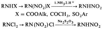 RR'NNO2, либо прямым нитрованием вторичных малоосновных аминов смесью HNO3 и (СН3СО)2О или более основных аминов смесью HNO3, (СН3СО)2О и НСl.