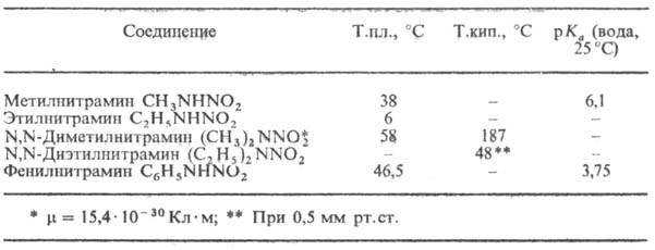 Низшие нитрамины, как правило, жидкости, масла или низкоплавкие твердые в-ва (см. табл.), хорошо раств. во мн. орг. р-рителях. Первичные нитрамины и N-нитрамиды легко раств. в воде. Большинство нитраминов взрывоопасны. АТОМЫ фрагмента C2N2O2 расположены практически в одной плоскости (длины связей и углы показаны на ф-ле I).
