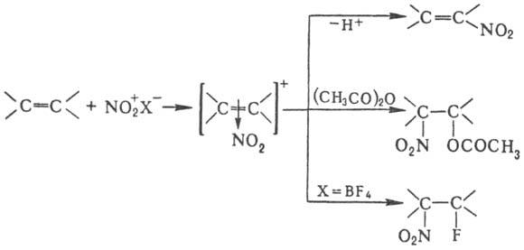 Для нитрования алкенов, циклоалкенов, диалкил- и диарилацети-ленов можно использовать N2O4, последний присоединяется по двойной связи, образуя вицинальные динитросоед., b-нитронитриты и b-нитронитраты, к-рые обычно легко отщепляют HNO2 или HNO3, давая непредельное нитро-соединение. Р-ция с ацетиленами приводит к смеси вици-нальных цис- и транc-динитросоед. наряду с продуктами окисления и деструкции.