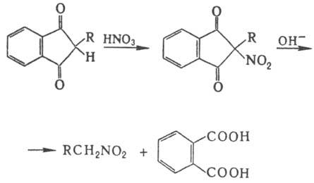 Соед. с активир. метиленовой группой можно нитровать и в кислых условиях; напр., при обработке диэтилмалоната HNO3 образуется нитродиэтилмалонат, нитрование в аналогичных условиях 1,3-индандиона с послед. щелочным гидролизом образующегося a-нитрокетона - удобный метод синтеза первичных нитроалканов: