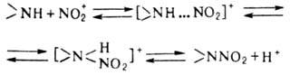 Электрофильное нитрование аминов в отличие от нитрования по атому С-обратимый процесс и протекает по схеме: