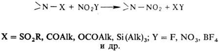 В лаб. условиях заместительное нитрование ацетамидов, сульфамидов, уретанов, имидов или их солей проводят в апротон-ной среде апротонными нитрующими агентами, напр. солями нитрония: