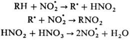 Радикальное нитрование характерно в осн. для парафинов и олефинов. Источником NO.2 служат HNO.3 и оксиды азота. Нитрование парафинов проводят разб. HNO3 под давлением при повыш. т-ре (Коновалова реакция). Р-ция нитрования протекает по схеме: