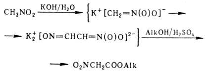 По хим. св-вам нитрометан-типичный представитель алифатич. питросоединений. Специфич. св-ва нитрометана связаны с наличием трех реакционноспособных связей С—Н, а также с нестабильностью метаннитронатов - производных аци-фор-мы. На этом основано применение нитрометана в синтезе нитроцетатов: